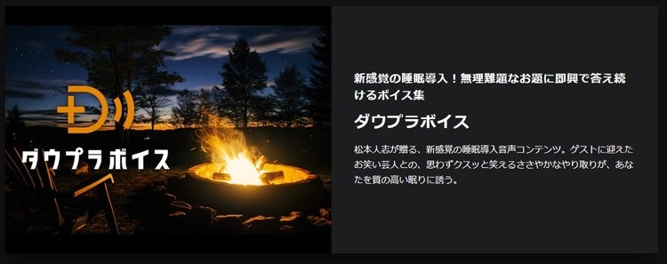 ダウンタウンの二人がゲストを迎え、テーマトークを繰り広げる音声企画。映像付きポッドキャストのような形式で、普段のバラエティでは聞けない“本音の声”が聞けます。新感覚の睡眠導入お笑い音声コンテンツ!添い寝のお供にもおすすめです!
