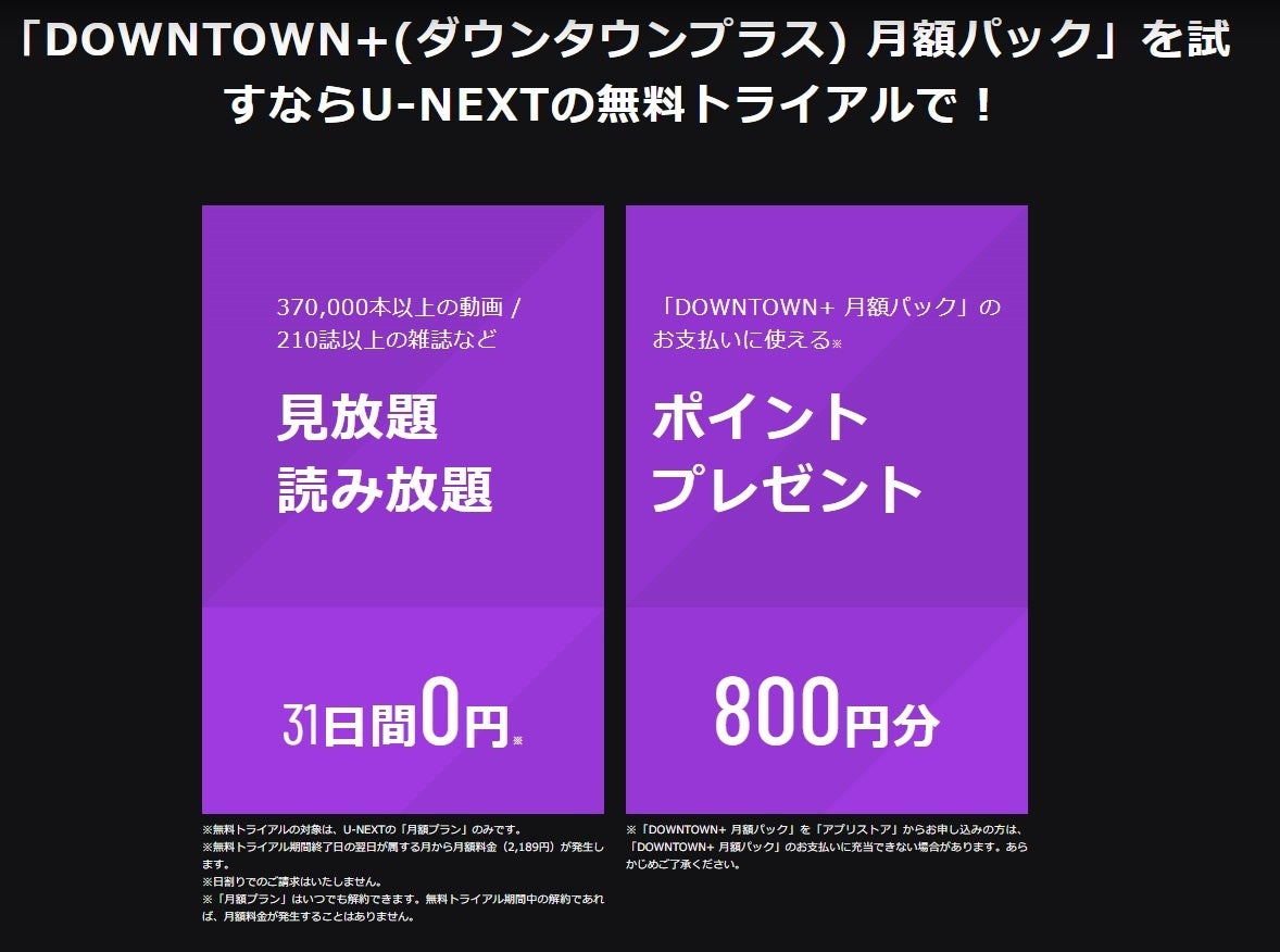 まずはU-NEXTの無料トライアルを活用してお得にダウンタウンプラス月額パックを視聴してみませんか?