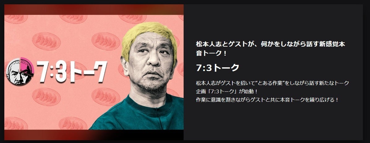 松本人志が毎回ゲストを招いて“とある作業”をしながらトークするという新企画!割合的に、作業7:トーク3になるのか、トーク7:作業3になるのかは観てからのお楽しみ!招かれたゲストと本音のトークは地上波では観られないものも期待できそうです!