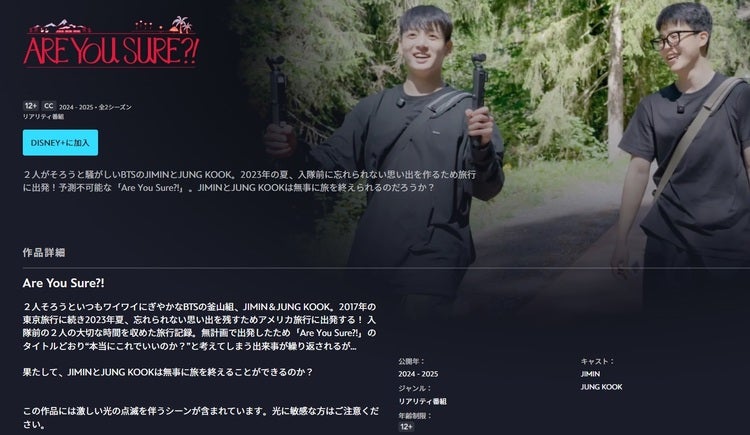 世界的スーパースターのBTSの最年少メンバー2人が、オフモード大全開で休暇を過ごす貴重なバラエティリアリティーショーのAre You Sure?! 。Season1も話題になりましたが、今回のSeason2では兵役を終えたばかりの2人がガイドブックとわずかな予算だけを頼りに一歩一歩自分自身と、友情を再発見する旅に出ます。