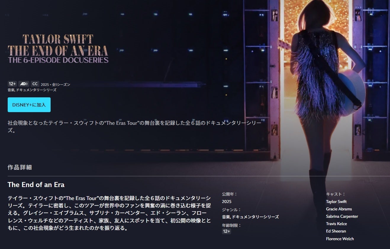 社会現象を巻き起こした『THE ERAS TOUR』の企画から舞台裏、そして影響までを描いた6エピソードからなるドキュメンタリーシリーズです。テイラーのツアーが世界中で話題を呼び、そしてファンを熱狂させたテイラーの人生そのものに迫るドキュメンタリー。12月12日(金)第1話~第2話17:00配信開始予定。