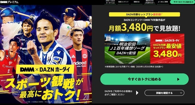 スポーツ配信サービスのDAZNに加入するなら、単体で契約するよりもDMM.comとDAZNがセットになった「DMM×DAZNホーダイ」プランがかなりお得です。