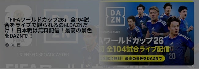 2026年6月にアメリカ、カナダ、メキシコの3カ国で開催されるサッカーの祭典「FIFAワールドカップ2026」では、参加国が48に拡大し、合計104試合が行われます。この史上最大規模の大会において、日本国内で全104試合をライブ配信するのはスポーツ配信サービスの「DAZN」だけです。