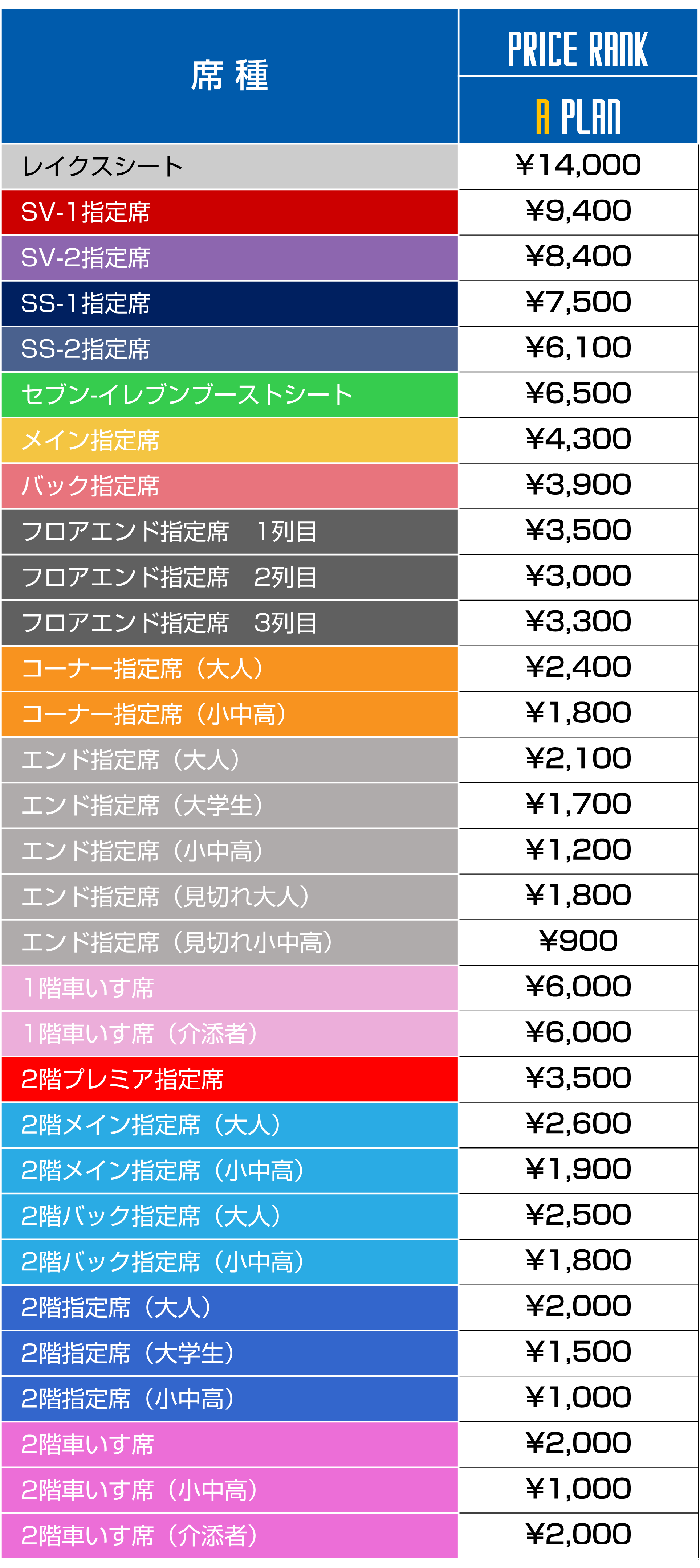 2024-25シーズンは、試合ごとにチケット価格が3段階に変動する「フレックスプライス制」を導入いたします。 本節は「Aプラン」となります。