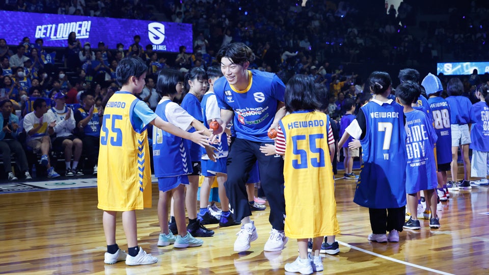 両チームの選手が入場。滋賀レイクスの選手がサイン入りのボールを投げ込みます!ここからは試合まで選手たちがウォームアップで試合に向けて体を動かす様子がご覧いただけます。