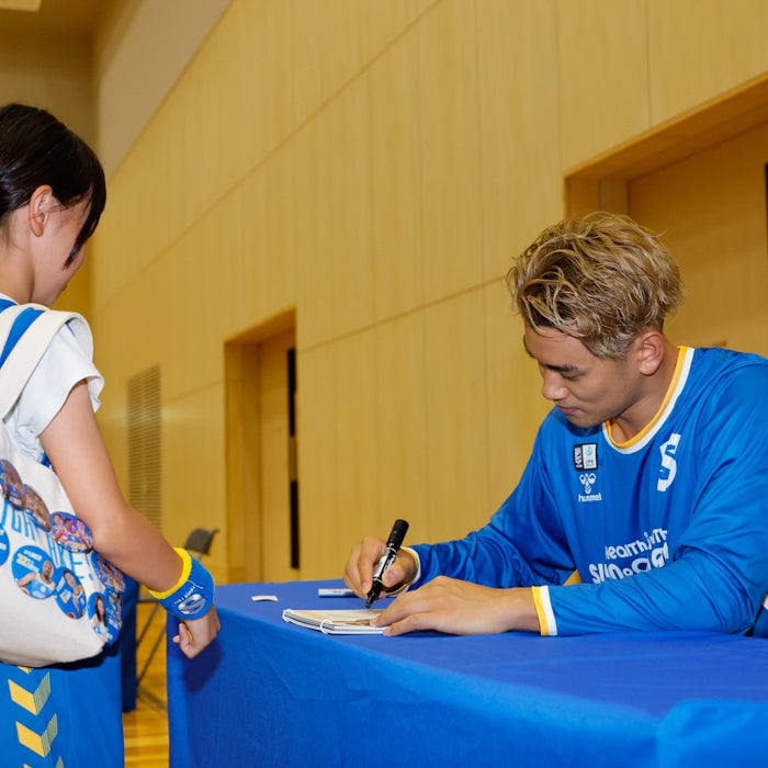 両チームの選手が入場。滋賀レイクスの選手がサイン入りのボールを投げ込みます!ここからは試合まで選手たちがウォームアップで試合に向けて体を動かす様子がご覧いただけます。