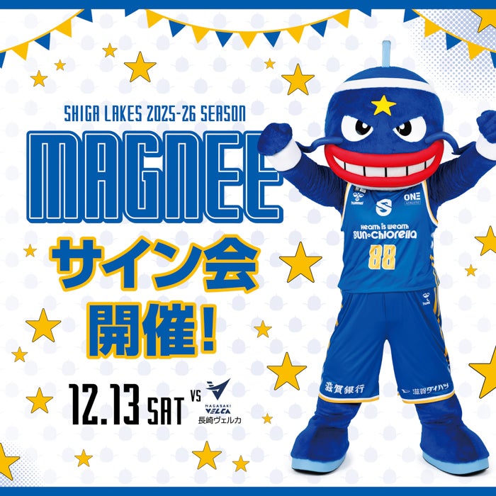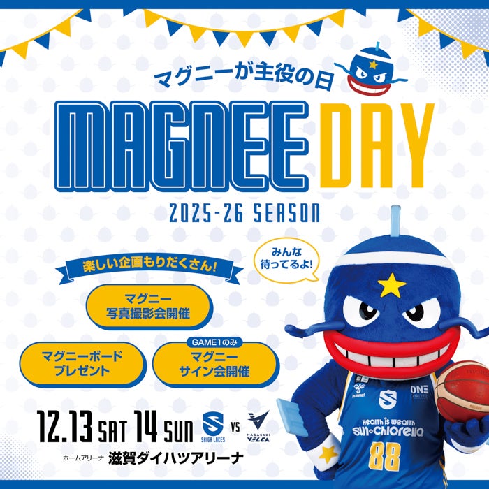 12月13日(土)と14日(日)に滋賀ダイハツアリーナで開催するホームゲーム「りそなグループ B.LEAGUE 2025-26 SEASON B1リーグ戦 第14節 滋賀レイクスvs長崎ヴェルカ」にて、滋賀レイクスのマスコットキャラクター「マグニー」が主役となる、マグニーDAYを開催いたします。