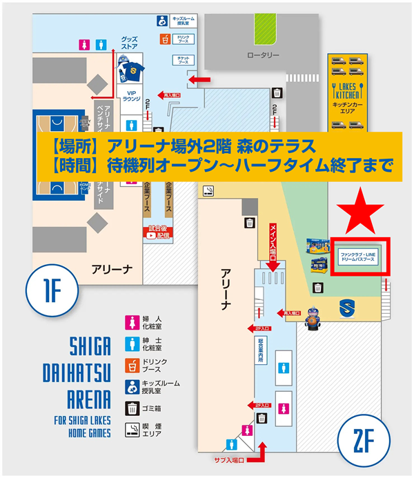 この度、滋賀レイクスでは2025-26シーズンのホームゲームにおける「クラブレイクスブース」「レイクスドリームPASSブース」の設置位置を、滋賀ダイハツアリーナ2階場外「森のテラス」へと変更いたします。