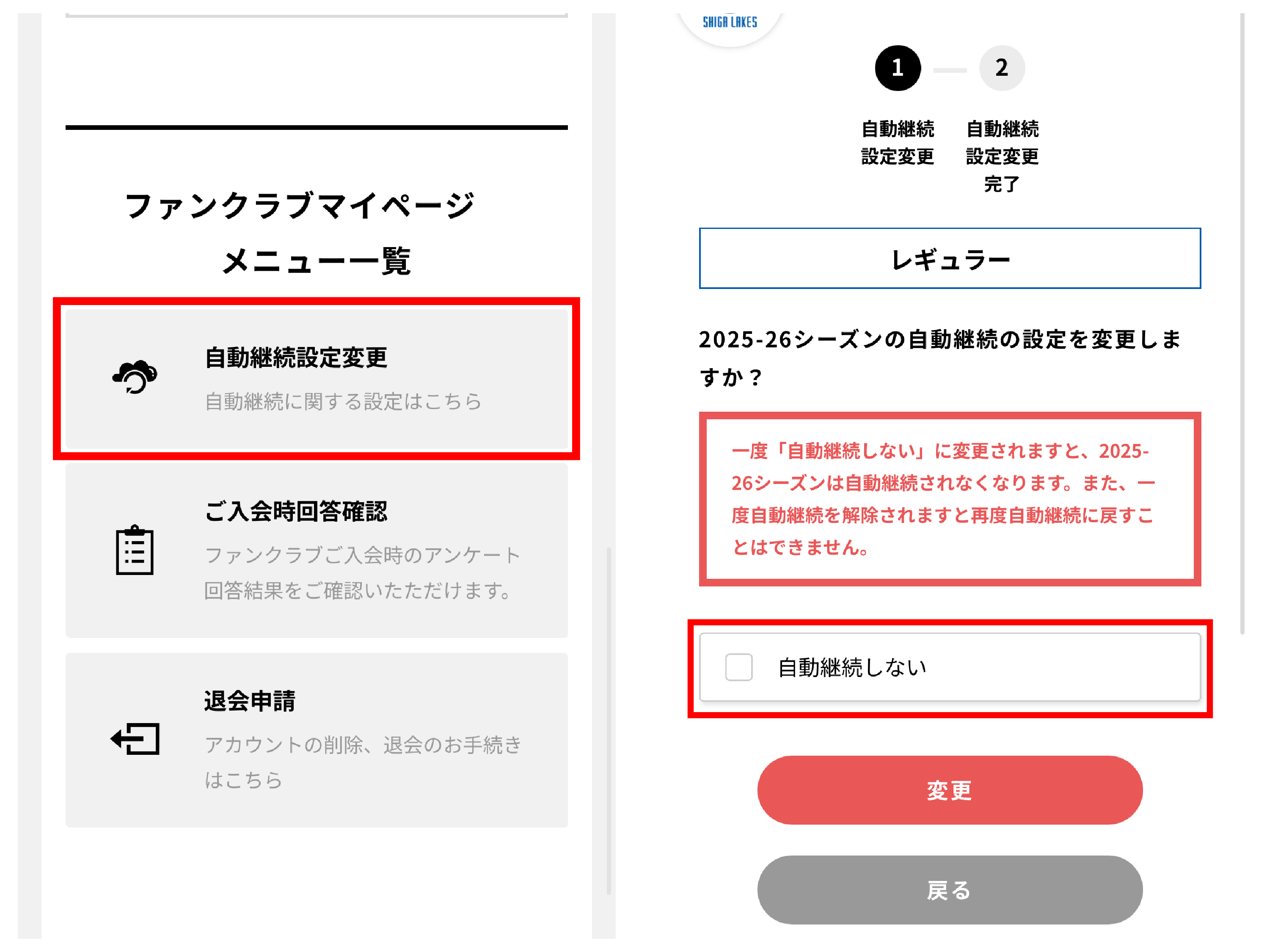 なお、一度自動継続を解除した場合、再度自動継続を希望することはできません。2025-26シーズン ファンクラブへの入会を希望する場合は、再度お客さま自身でご入会手続きをお願いいたします。