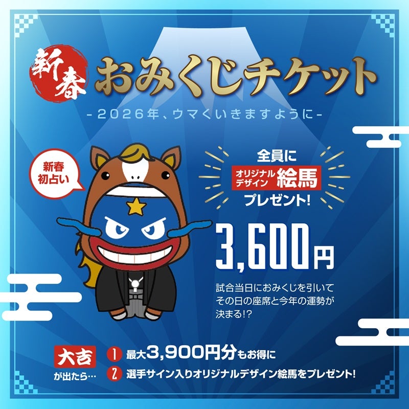 大吉を引いた方には、チケット代が最大3,900円分もお得になる他、オリジナルデザイン絵馬に全選手のサインを入れてプレゼントいたします!