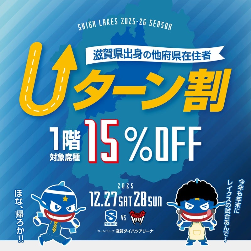 滋賀レイクスでは、12月27日(土)-28日(日)と2026年1月3日(土)-4日(日)に開催されるホームゲーム2節を対象に、滋賀県出身の他府県在住の方はお得に試合観戦ができる「Uターン割チケット」、当日のおみくじで席種が決まる「新春おみくじチケット」の2種類の企画チケットを発売します。