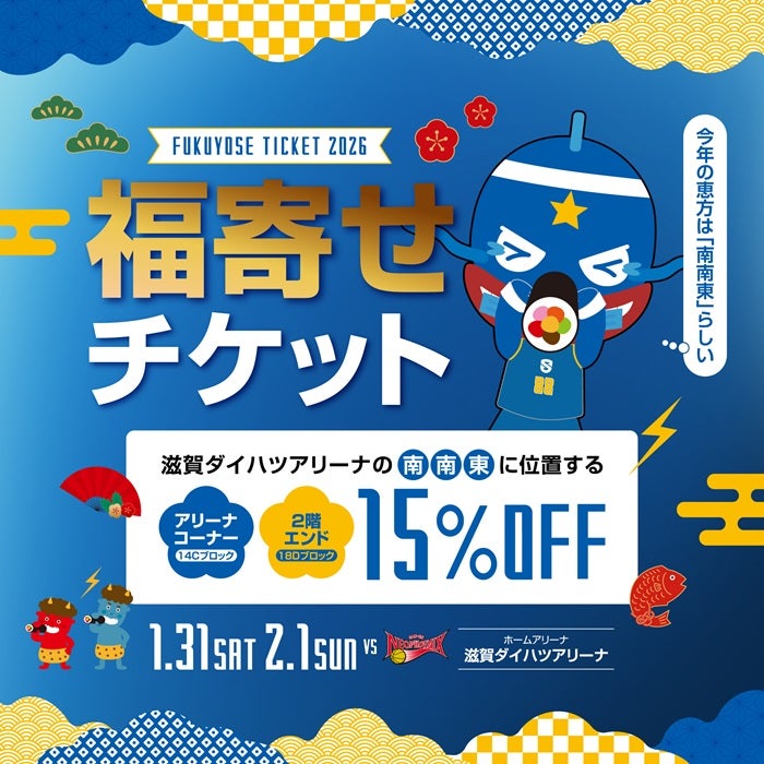 滋賀レイクスでは、2026年1月31日(土)-2月1日(日)と2月14日(土)-15日(日)に開催されるホームゲームを対象に、 2026年の恵方(縁起の良い方角)「南南東」に位置する対象席種が15%OFFで購入できる「福寄せチケット」、選手からのオリジナルメッセージが付いてくる「バレンタインスペシャルシート」の2種類の企画チケットを発売します。