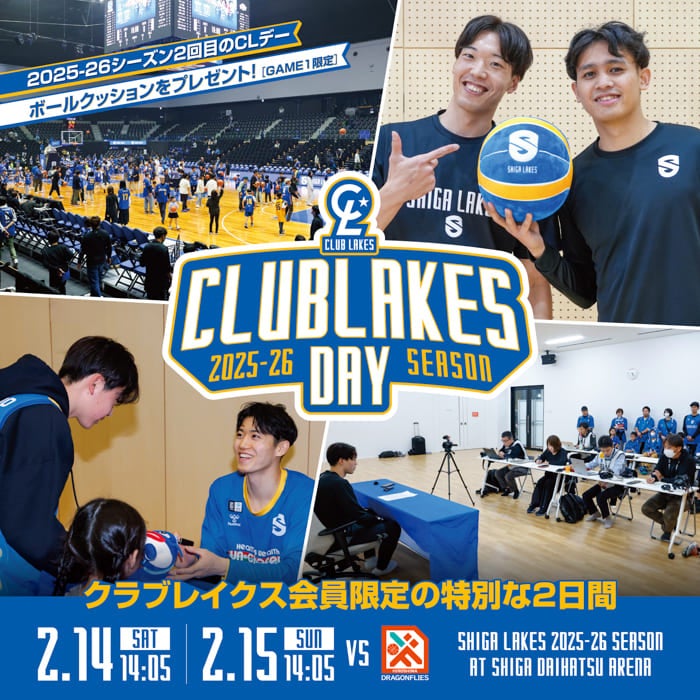 2026年2月14日(土)-15日(日)に滋賀ダイハツアリーナで行われる「りそなグループ B.LEAGUE 2025-26 B1リーグ戦 第23節 滋賀レイクスvs.広島ドラゴンフライズ」にて、2025-26シーズン「クラブレイクス」会員の皆様を対象とした「CLUB LAKES DAY(クラブレイクスデー)」を開催いたします。