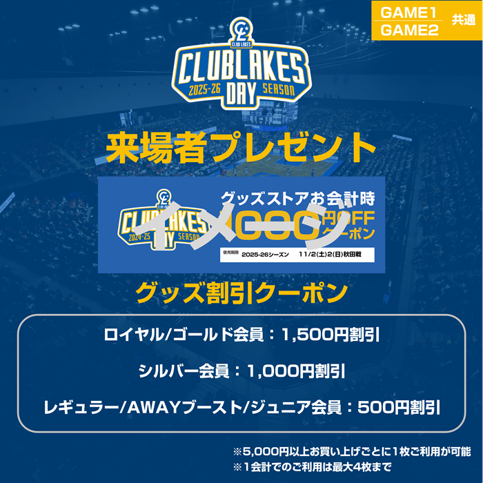 クラブレイクスデーの2日間限りでご利用可能な「グッズ割引クーポン」をプレゼントいたします。この機会にグッズを購入して、試合観戦をより楽しみましょう!