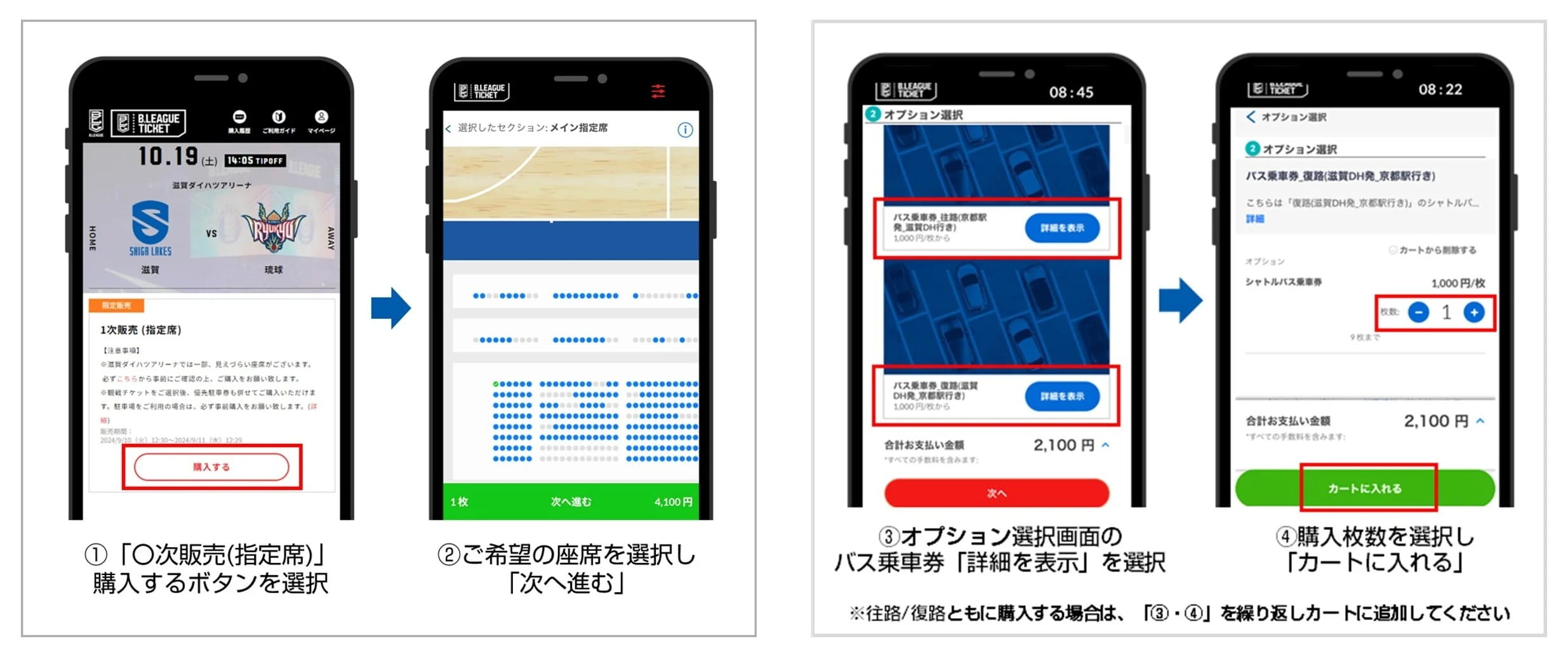 Bリーグチケット「〇次販売(指定席)」より座席選択後、オプション選択画面で「バス乗車券」をお選びください。