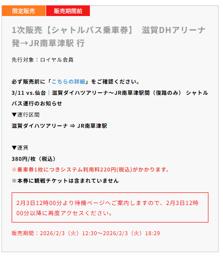 すでに観戦チケットをお持ちの方は、Bリーグチケット「〇次販売【滋賀ダイハツアリーナ→JR南草津駅行 シャトルバス乗車券】」よりお買い求めください。